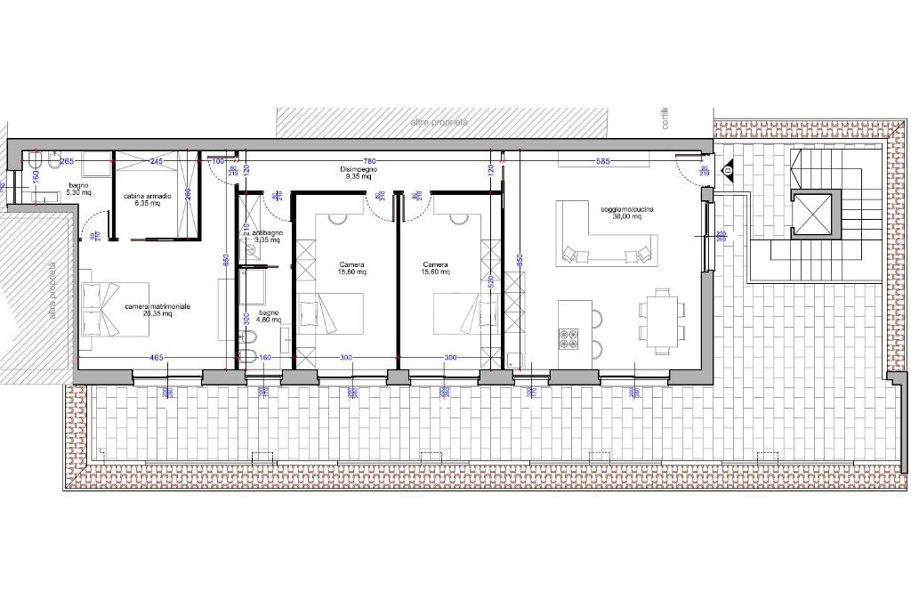 L'appartamento è composto da quattro locali, che si affacciano tutti sull'ampio terrazzo, e sono progettati per garantire comfort e praticità. La zona giorno è luminosa e accogliente, ideale per momenti di relax e convivialità. Le camere da letto sono spaziose e ben distribuite, assicurando privacy e tranquillità.